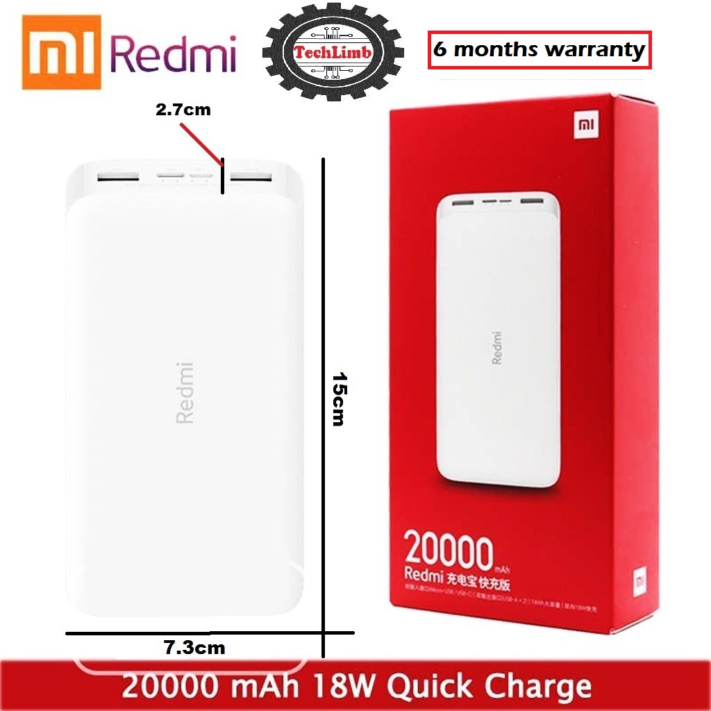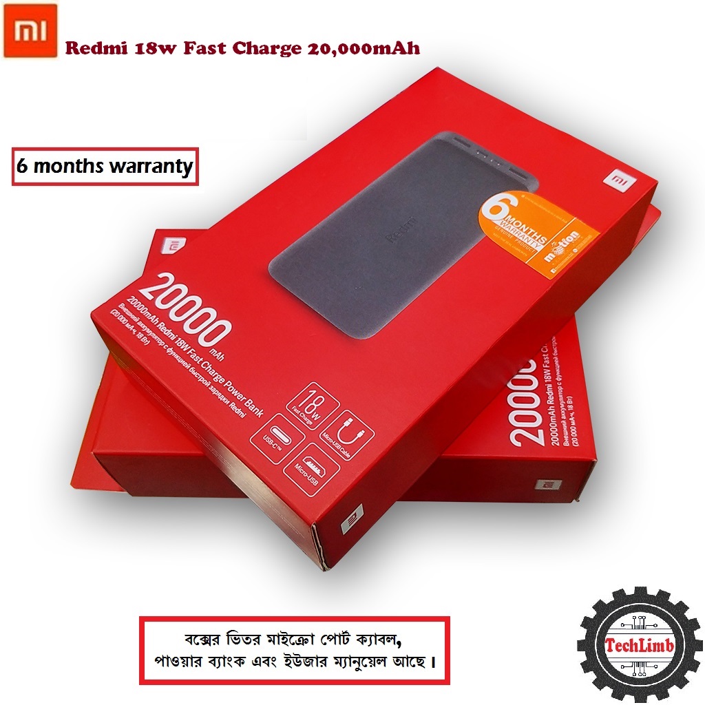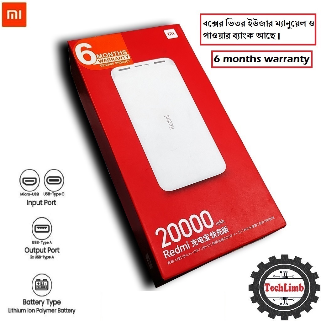 Redmi Powerbank 20000mAh 18W Fast Charge Price in BD – Original Xiaomi Redmi PB200LZM Quick Charge 3.0 Portable Power Bank with Dual USB Type-C & Micro USB Input – 6 Months Warranty – TechLimb Original Mi Power Bank for iPhone Android Tablets.